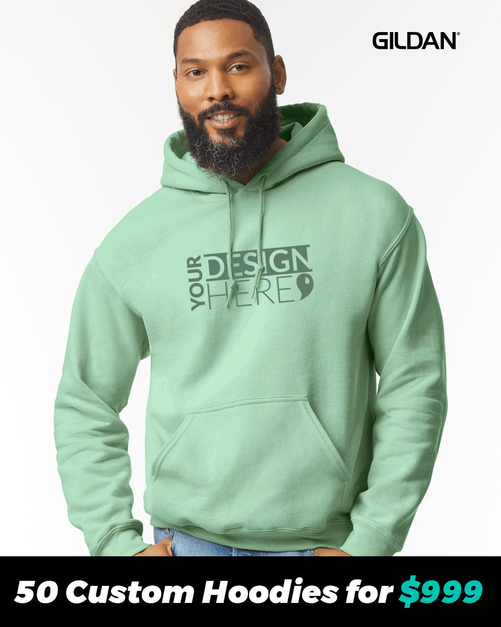 Get 50 custom Gildan hoodies with a 1-color print in 1-location for only $999! Free shipping to your door. No fees for setup or screens.