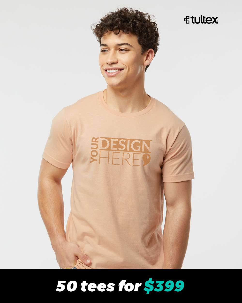 Finally, a budget-friendly ring-spun (soft) tee available in great colors! Get 50 of these tees screenprinted in 1-color (1-location, front or back) for $399. No other fees or setup charges. Free shipping!
