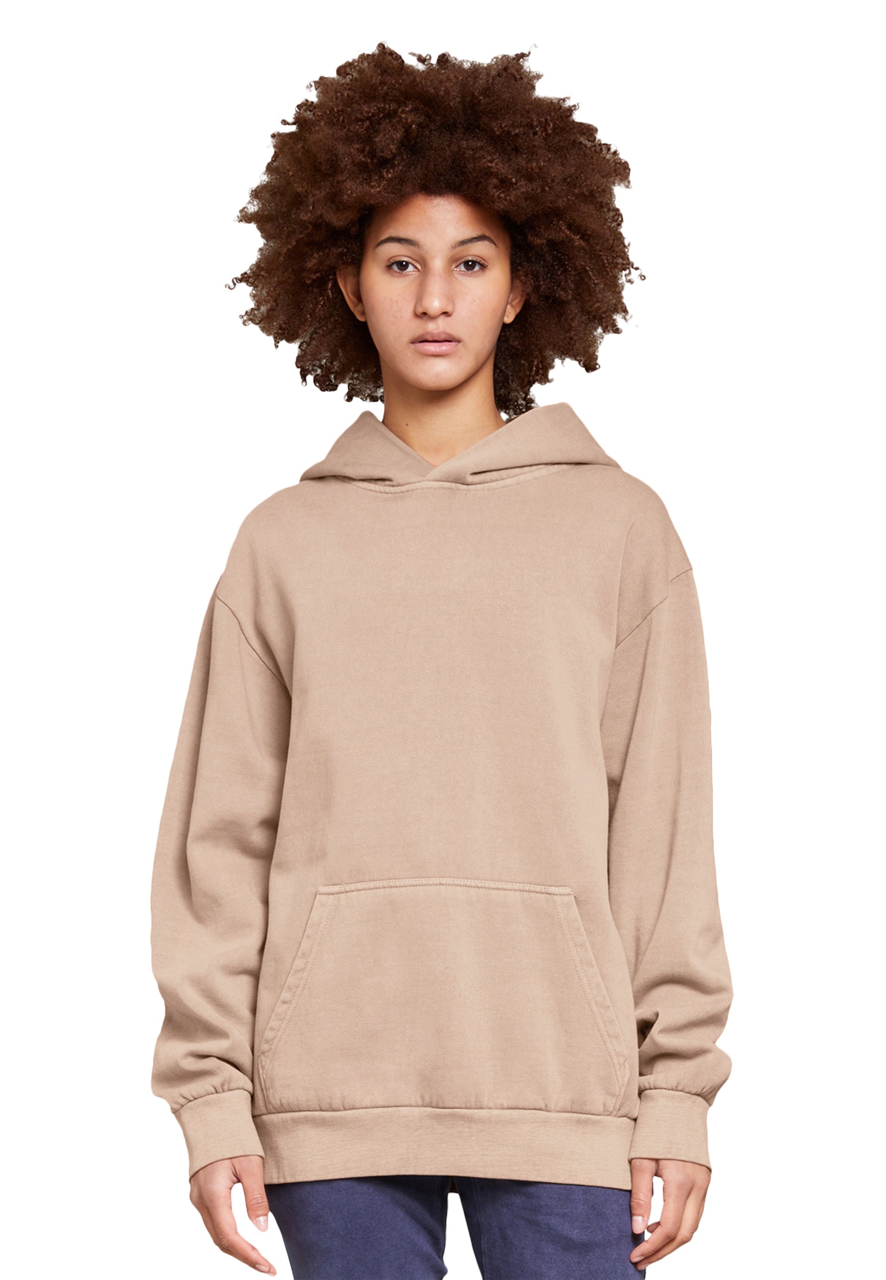 This hoodie has been garment dyed which means the fabric was dyed after it was cut and sewn. This method creates a softer, broken-in feel, and the color may appear slightly washed out, or more “lived-in”. Garment dyeing also results in more subtle color variations, especially at seams and edges giving it that unique, worn-in aesthetic.